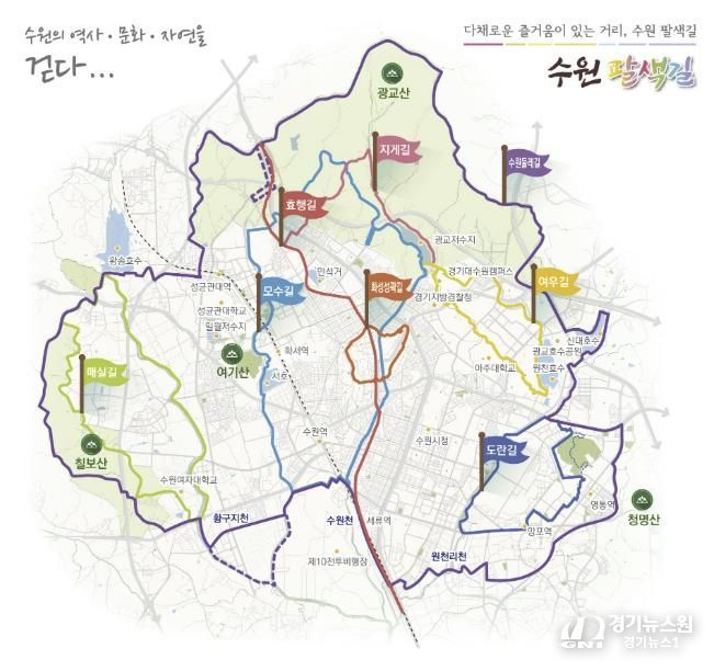 [경기뉴스원/경기뉴스1] | 수원특례시는 수원 전역 수원팔색길 구간에서 도시개발로 단절된 노선을 복원하고 노후 이정표와 시설물을 교체하는 ‘수원팔색길 종합정비’를 5월까지 추진한다.