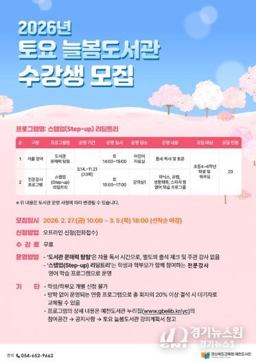 [경기뉴스원/경기뉴스1] | 경상북도교육청 예천도서관은 지역 어린이들의 문해력 향상과 영어 학습 역량 강화를 지원하기 위해 2026년 토요 늘봄도서관 수강생을 모집한다.