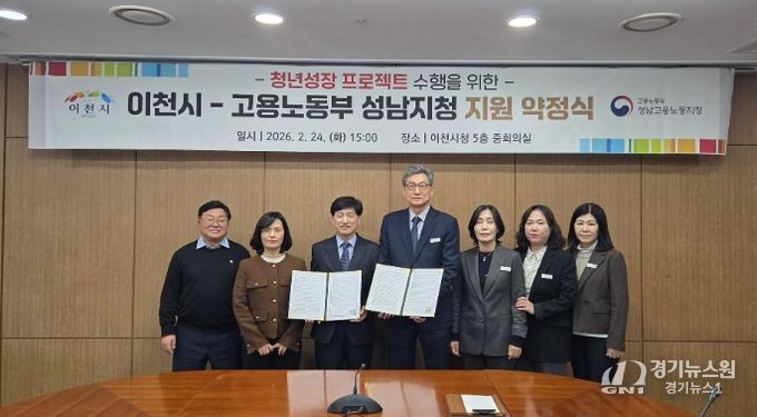 [경기뉴스원/경기뉴스1] | 이천시는 2월 24일 이천시청 5층 중회의실에서 경기지방고용노동청 성남지청과 ‘청년성장프로젝트’ 지원약정을 체결했다고 밝혔다. 이날 약정식에는 이천시와 경기지방고용노동청 성남지청, 한국고용서비스진흥원 관계자들이 참석해 사업의 원활한 추진과 상호 협력을 다짐했다.