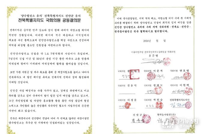 [경기뉴스원/경기뉴스1] | 진안군이 지역의 핵심 현안인 양수발전소 유치를 위해 전북 정치권과 행정이 함께하는 협력 체계를 이끌어 내며 본격 행보에 나섰다. 지자체 주도 사업에 대해 전북특별자치도지사와 전북 지역 국회의원, 군수가 공동으로 서명에 참여한 것은 이번이 처음으로, 전북특별자치도가 하나의 목소리로 힘을 모았다는 점에서 의미를 더하고 있다.
