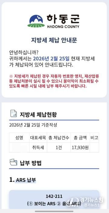 [경기뉴스원/경기뉴스1] | 하동군이 올해부터 카카오 체납세 알림톡을 활용하여 체납세 안내부터 결제까지 원스톱으로 가능한 ‘카카오 알림톡 모바일 전자고지 서비스’를 실시한다.