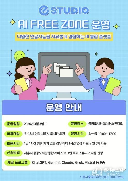 [경기뉴스원/경기뉴스1] | 시흥시중앙도서관은 시민들의 인공지능(AI) 활용 역량 강화를 위해 시 정보통신과와 협업해 도서관 3층 e-스튜디오에 ‘인공지능(AI) 프리 존(Free Zone)’을 구축하고, 오는 3월 3일부터 본격 운영에 들어간다.