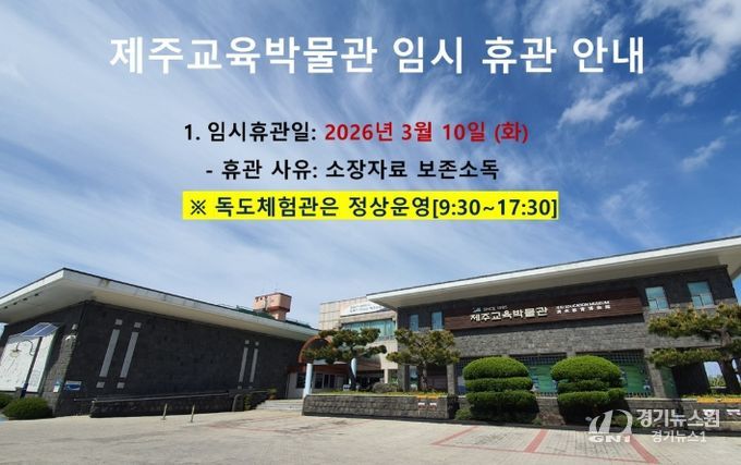 [경기뉴스원/경기뉴스1] | 제주도교육청 제주교육박물관은 10일 소장자료의 안전한 보존과 쾌적한 관람 환경 조성을 위해 임시 휴관을 실시한다.