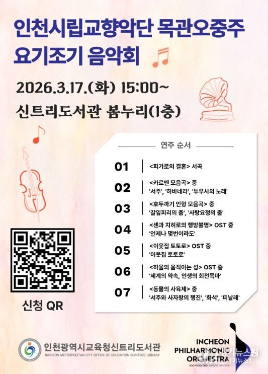 [경기뉴스원/경기뉴스1] | 인천광역시교육청신트리도서관은 오는 17일 도서관 내 봄누리홀에서 지역 주민을 대상으로 ‘인천시립교향악단과 함께하는 해설이 있는 음악회’를 개최한다.
