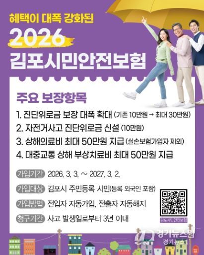 [경기뉴스원/경기뉴스1] | 김포시는 3월 3일부터 시민들이 일상생활 중 겪을 수 있는 불의의 사고에 대비해 보장 항목을 강화한 ‘2026년 김포시민안전보험’을 시행한다고 밝혔다.