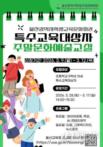 [경기뉴스원/경기뉴스1] | 울산학생교육문화회관은 초등학교 5학년 이상 특수교육 대상 학생의 진로 탐색과 소질계발을 돕고자 ‘제1기 주말 문화예술 교실’을 운영한다.