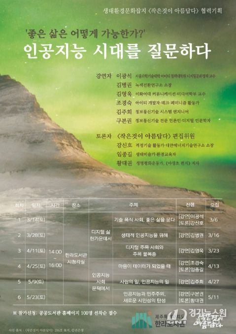 [경기뉴스원/경기뉴스1] | 제주특별자치도 한라도서관은 인공지능(AI)이 일상이 된 시대에 기술과 자연, 인간의 공존 해법을 모색하는 특별 기획 프로그램 '인공지능 시대를 질문하다'를 개최한다.