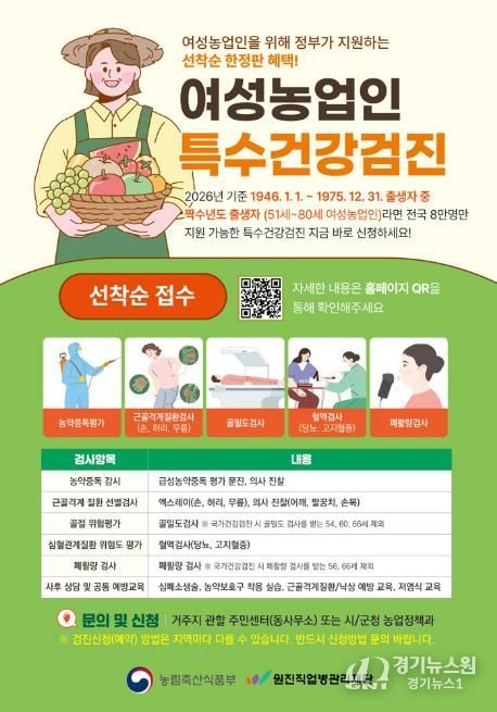 검진은 수원시 권선구에 위치한 수원덕산병원에서 진행되며, 근골격계 질환, 심혈관계 질환, 골절·낙상 위험, 농약 노출 관련 검사, 폐기능 검사 등 농작업 환경과 관련된 건강검진 항목으로 구성됐다. 또한 전문의 상담과 예방교육도 함께 제공된다.