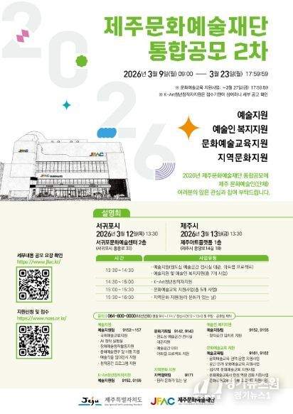 [경기뉴스원/경기뉴스1] | 제주문화예술재단은 도내 예술인의 창작 활동 지원과 지속가능한 문화예술 생태계 조성을 위해 ‘2026년 지원사업 통합공모 2차’를 3월 23일까지 진행한다.