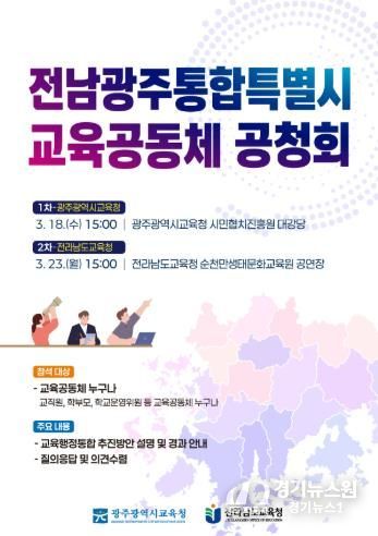 [경기뉴스원/경기뉴스1] | 광주시교육청 ‘광주전남교육행정통합실무단’과 전남도교육청 ‘전남광주교육행정통합추진단’이 교육통합과 관련해 시도민의 이해를 돕기 위해 ‘전남광주통합특별시 교육공동체 공청회’를 개최한다.