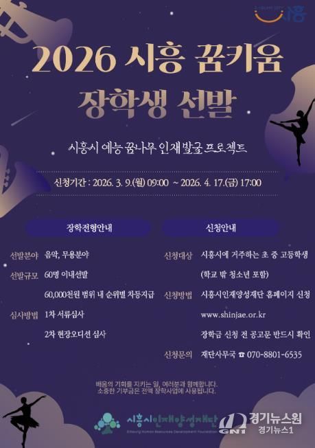 [경기뉴스원/경기뉴스1] | 시흥시인재양성재단은 지역 내 예능 분야 인재를 발굴ㆍ육성하기 위해 ‘2026년 시흥 꿈키움 장학생’을 60명 이내로 선발한다.