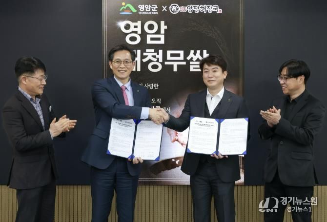 [경기뉴스원/경기뉴스1] | 영암군이 11일 군청에서 ‘일품양평해장국’ 외식 프랜차이즈 ㈜우분트월드와 영암 농특산물 판매 활성화 업무협약을 체결했다.