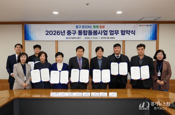 [경기뉴스원/경기뉴스1] | 대구 중구는 지난 11일 구청 상황실에서 ‘중구 온(ON), 함께 돌봄’ 통합돌봄 지역특화사업의 안정적 추진을 위해 관내 7개 기관과 업무협약을 체결하고, 민·관 협력 기반의 지역 통합 돌봄 체계 구축에 나섰다.