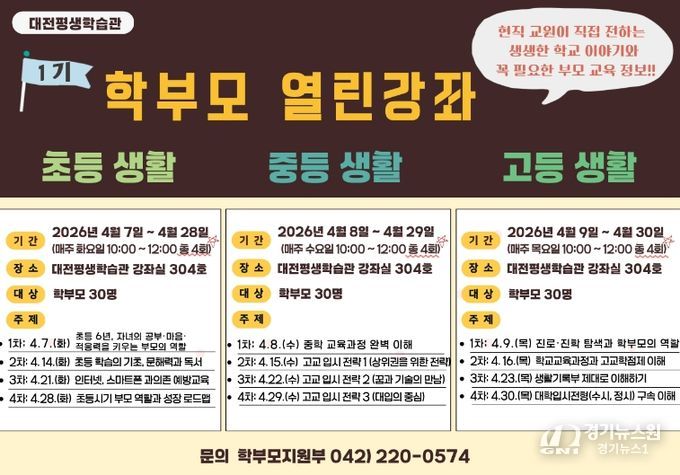 [경기뉴스원/경기뉴스1] | 대전평생학습관은 학부모가 자녀의 발달 단계에 따른 학교생활을 이해하고 교육 역량을 높일 수 있도록 돕는 ‘학부모 열린강좌’ 1기 수강생을 모집한다고 밝혔다.