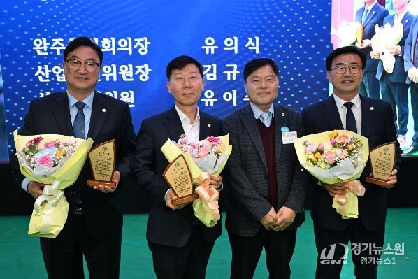 [경기뉴스원/경기뉴스1] | 완주군의회 유의식 의장과 김규성, 유이수 의원이 13일 지역 농업 발전과 농업인 권익 증진에 기여한 공로를 인정받아 한국후계농업경영인 완주군연합회로부터 감사패를 수상했다.