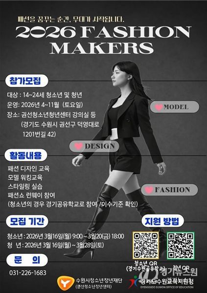 [경기뉴스원/경기뉴스1] | 수원시청소년청년재단 권선청소년청년센터는 패션 분야 진로에 관심 있는 청소년과 청년을 대상으로 ‘패션메이커스(Fashion Makers)’ 프로그램 참가자를 모집한다.
