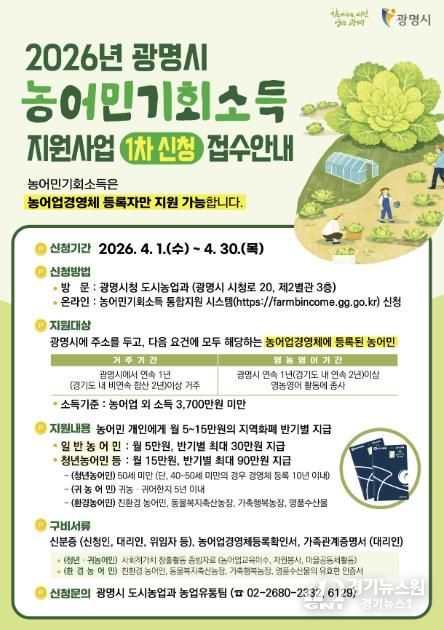 [경기뉴스원/경기뉴스1] | 광명시는 오는 4월 1일부터 4월 30일까지 ‘농어민 기회소득 지원사업 1차’ 신청을 받는다.