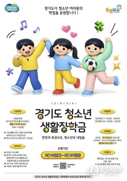 [경기뉴스원/경기뉴스1] | 가평군은 복권기금을 재원으로 하는 ‘2026년 경기도 청소년 생활장학금’ 신청을 이달 16일부터 27일까지 접수한다.