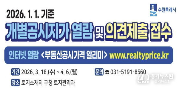 [경기뉴스원/경기뉴스1] | 수원시 영통구는 3월 18일부터 4월 8일까지 20일간 2026년 1월 1일 기준 개별공시지가에 대한 열람을 실시하고 토지소유자 및 이해관계인의 의견을 접수한다.