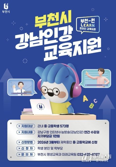 [경기뉴스원/경기뉴스1] | 부천시는 2026년 ‘부천-런(Learn) 온라인 교육지원’ 사업을 추진한다고 19일 밝혔다. 이는 지난해에 이어 시행되는 것으로, 관내 중·고등학생들에게 온라인 교육 기회를 제공하고 가정의 사교육비 부담을 완화하는 데 중점을 둔다.