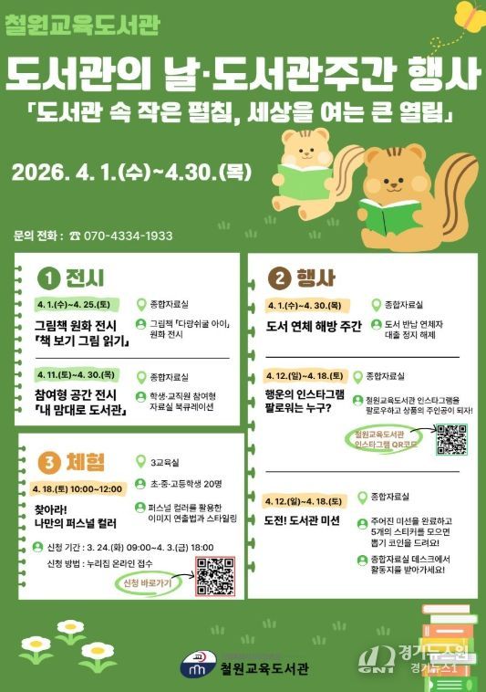 [경기뉴스원/경기뉴스1] | 철원교육도서관은 4월 12일 도서관의 날과 4월 12일부터 18일까지의 도서관 주간을 맞아 도서관 이용자와 지역 주민들을 대상으로 도서관의 날·도서관 주간 행사를 운영한다.