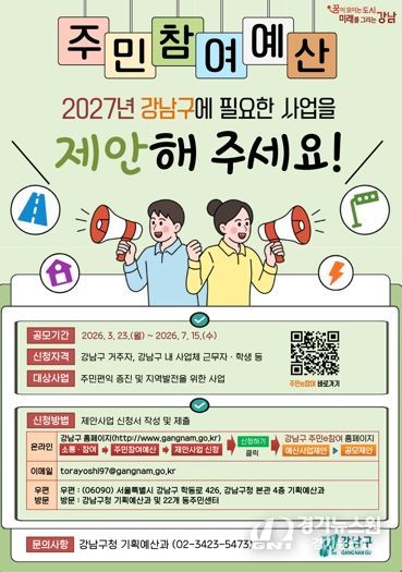 [경기뉴스원/경기뉴스1] | 꿈이 모이는 도시, 미래를 그리는 강남구가 2027년도 예산편성에 반영할 주민참여예산 제안사업 공모를 3월 23일부터 7월 15일까지 진행한다. 올해 공모 규모는 총 13억 원으로, 주민이 직접 생활 속 불편을 해결하고 지역에 필요한 사업을 제안해 예산에 반영하는 참여형 제도다.