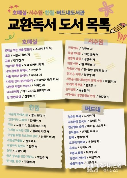 [경기뉴스원/경기뉴스1] | 수원시 권선구 4개 공공도서관(호매실·서수원·한림·버드내도서관)이 책을 매개로 서로의 생각과 감상을 나누는 ‘교환독서 클럽’ 참여팀을 모집한다.