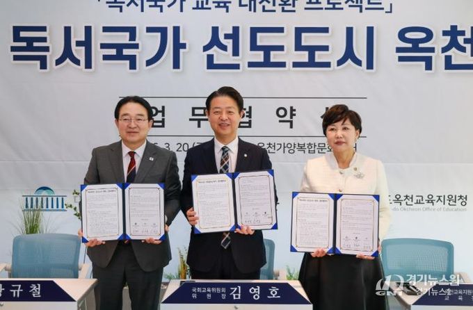[경기뉴스원/경기뉴스1] | 옥천교육지원청은 3월 20일 오전 10시, 옥천가양복합문화센터에서 옥천군, 국회 교육위원회와 함께 '독서국가 선도도시 옥천'조성을 위한 업무협약(MOU)을 체결하고, 인공지능(AI) 시대를 주도할 창의적 미래 인재 양성을 위해 긴밀히 협력하기로 했다.