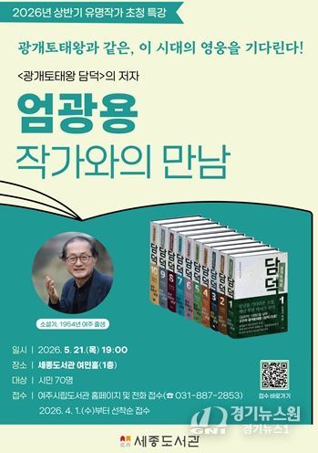 [경기뉴스원/경기뉴스1] | 여주시는 오는 5월 21일 오후 7시 세종도서관에서 대하소설 '광개토태왕 담덕'의 저자, 엄광용 작가를 초청하여 작품과 작가의 세계관에 대해 시민들과 이야기하는 ‘엄광용 작가와의 만남’을 운영한다.