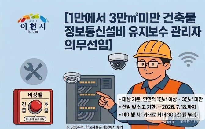 [경기뉴스원/경기뉴스1] | 이천시는 관내 일정 규모 이상의 건축물 소유자 및 관리주체를 대상으로 ‘정보통신설비 유지보수·관리자 선임 및 신고’를 철저히 이행해 줄 것을 당부했다.