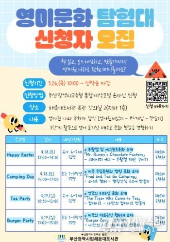 [경기뉴스원/경기뉴스1] | 부산광역시립해운대도서관은 오는 4월 18일과 19일 해운대도서관에서 6~7세 유아와 1~3학년 초등학생 50여 명을 대상으로 영미문화 체험 특강 ‘영미문화 탐험대’를 운영한다.