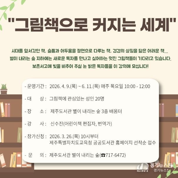 [경기뉴스원/경기뉴스1] | 제주도교육청 제주도서관은 4월 9일부터 6월 11일까지 자료실 보존서고에 소장된 그림책을 재조명하고 지역주민에게 깊이 있는 독서 경험을 제공하기 위해 ‘그림책으로 커지는 세계’ 참가자를 모집한다.