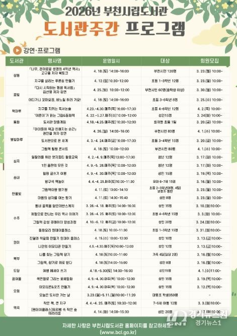 [경기뉴스원/경기뉴스1] | 부천시는 4월 ‘도서관의 날’과 제62회 도서관 주간을 맞아 ‘도서관 속 작은 펼침, 세상을 여는 큰 열림’을 슬로건으로 다양한 행사와 프로그램을 운영한다.