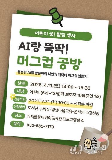 [경기뉴스원/경기뉴스1] | 인천광역시교육청서구도서관은 오는 4월, 어린이를 동반한 가족이 참여하는 생성형 AI를 활용한 특별 프로그램 ‘AI랑 뚝딱! 머그컵 공방’을 운영한다.
