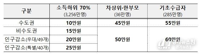 소득 하위 70% 국민에게 거주 지역별로 수도권 10만원, 비수도권 15만원, 인구감소 우대지역 20만원, 인구감소 특별지역 25만원을 지급할 예정이며, 한부모가족・차상위계층은 45만원, 기초생활수급자는 55만원을 지급하되 비수도권에 거주하는 경우에는 1인당 5만원을 추가 지급한다.