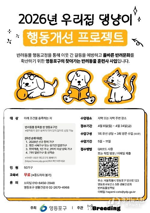 [경기뉴스원/경기뉴스1] | 영등포구가 반려동물의 문제행동으로 어려움을 겪고 있는 구민들을 지원하기 위해 찾아가는 반려동물 훈련 사업인 ‘우리집 댕냥이 행동개선 프로젝트’를 운영한다고 밝혔다.