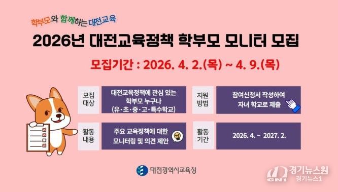 [경기뉴스원/경기뉴스1] | 대전시교육청은 2026년 대전 교육 정책 학부모 모니터를 4월 2일부터 9일까지 각급 학교 학부모를 대상으로 모집한다고 밝혔다.