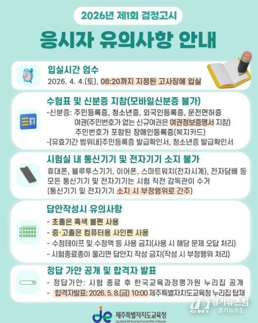 [경기뉴스원/경기뉴스1] | 제주특별자치도교육청은 4일 ‘2026년도 제1회 초졸·중졸·고졸 검정고시’를 제주중앙중학교, 서귀중앙여자중학교, 제주교도소, 제주소년원 등 4곳에서 실시한다.