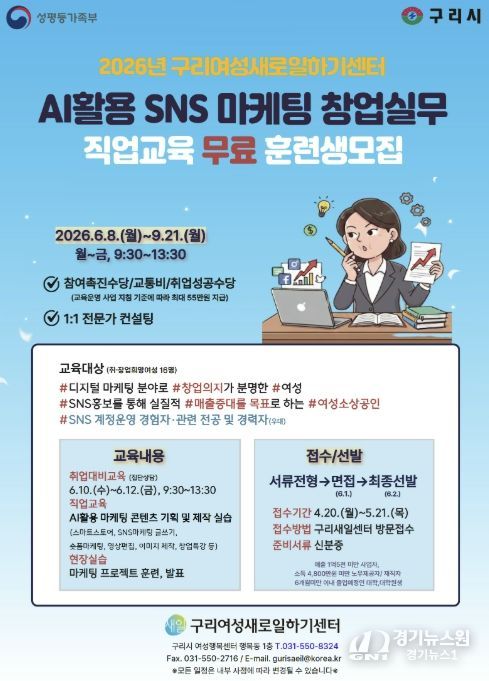 [경기뉴스원/경기뉴스1] | 구리시는 구리새일센터에서 여성들의 디지털 마케팅 역량을 강화하고 성공적인 취·창업을 지원하기 위해 ‘AI 활용 SNS 마케팅 창업 실무’ 직업교육훈련 과정의 교육생을 오는 4월 20일부터 모집한다고 밝혔다.