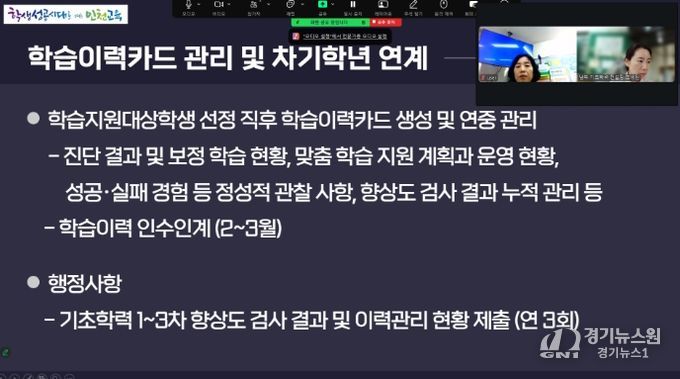 주요 내용은 ▲기초학력 보장 계획 및 예산 활용 점검 ▲학습 지원대상학생 지원협의회 운영 ▲지원 프로그램 미참여 학생 지원 방안 ▲기초학력 보장 프로그램 운영 ▲성장기록 프로그램 활용 방법 등이다.