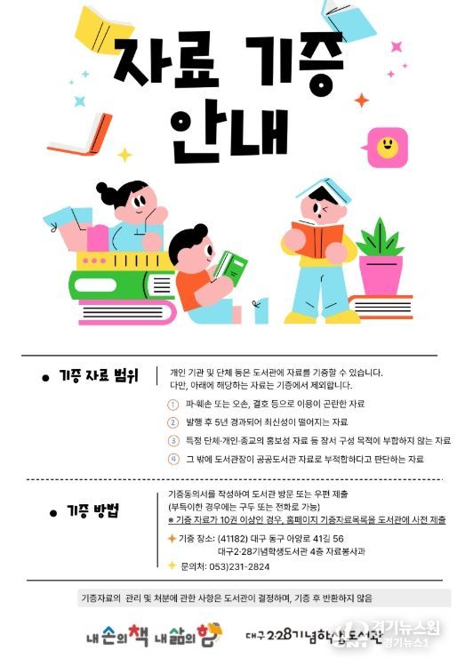 [경기뉴스원/경기뉴스1] | 대구시교육청 10개 공공도서관은 지역 사회의 독서문화 활성화와 지식정보 자원 공유를 위해 개인 및 기관·단체를 대상으로 양질의 자료 기증을 4월부터 연중 접수한다고 밝혔다.