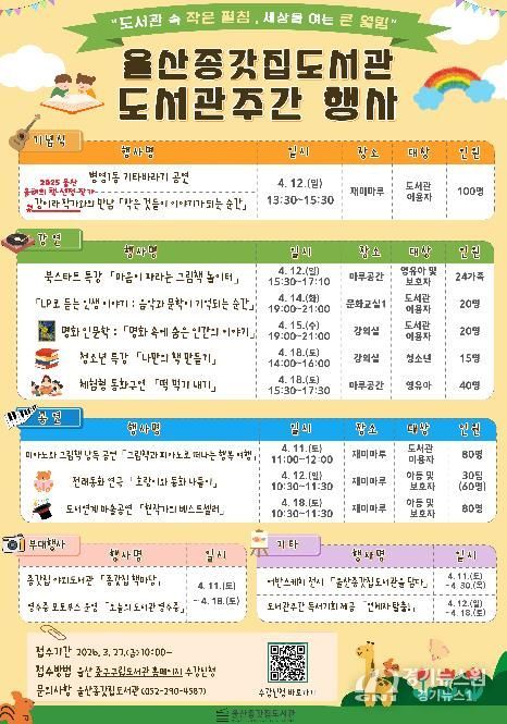 [경기뉴스원/경기뉴스1] | 울산 중구가 제62회 도서관의 날·도서관 주간(4. 12.~4. 18.)을 맞아 4월 11일부터 4월 18일까지 지역 내 도서관 10곳에서 ‘2026년 도서관의 날·도서관 주간 행사’를 개최한다.