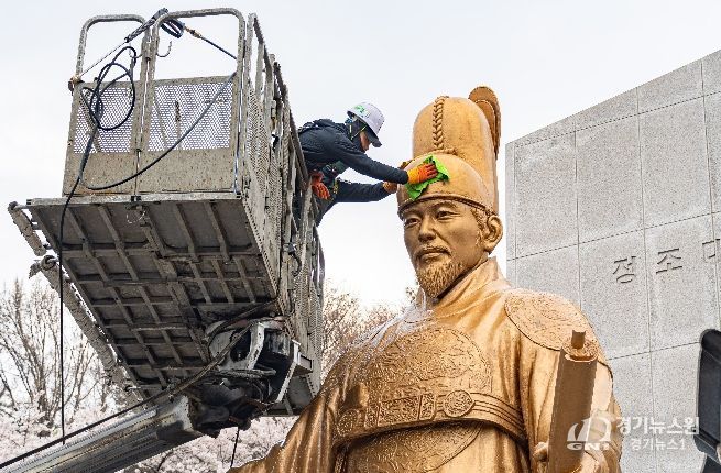 [경기뉴스원/경기뉴스1] | 수원특례시가 봄을 맞아 6일 팔달산에 있는 정조대왕 동상을 세척하고, 주변 환경을 정비했다.