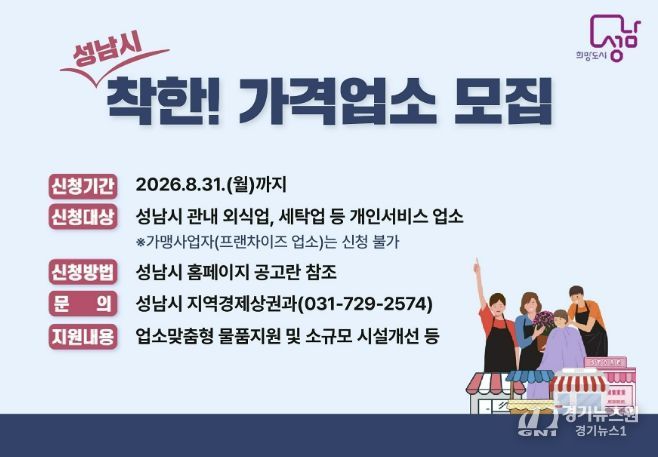 접수는 8월 31일까지 진행되며, 성남시청 홈페이지 공고문을 참고해 시청 지역경제상권과를 방문하거나 이메일 또는 우편으로 신청하면 된다.
