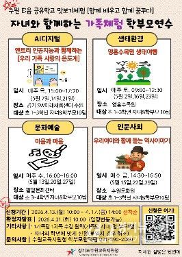 수원교육지원청은 오는 5월 한 달간 관내 초등학생 자녀와 학부모를 대상으로 지역 인프라를 적극 활용한‘2026년 가족체험 학부모연수’인 '공유학교 맛보기 체험:함께 배우고 함께 꿈꾸다'를 운영한다고 밝혔다.
