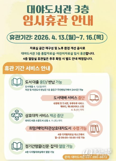 [경기뉴스원/경기뉴스1] | 군포시 대야도서관은 노후된 자료실 환경을 개선하고 이용자 중심의 효율적인 공간 재구성을 위해 오는 4월 13일부터 7월 16일까지 리모델링 공사를 실시하고, 해당 기간동안 3층 자료실을 임시휴관한다고 밝혔다.