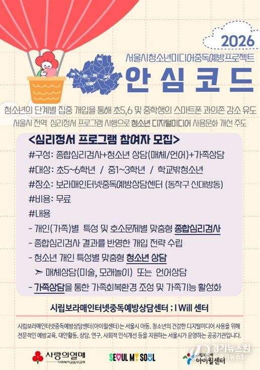 안심코드 프로그램은 올해 서울시 거주 초등학생 5~6학년 및 중학생 1~3학년, 학교 밖 청소년을 대상으로 무료 진행 중이며, 자세한 문의 및 신청은 시립보라매인터넷중독예방상담센터에서 할 수 있다.