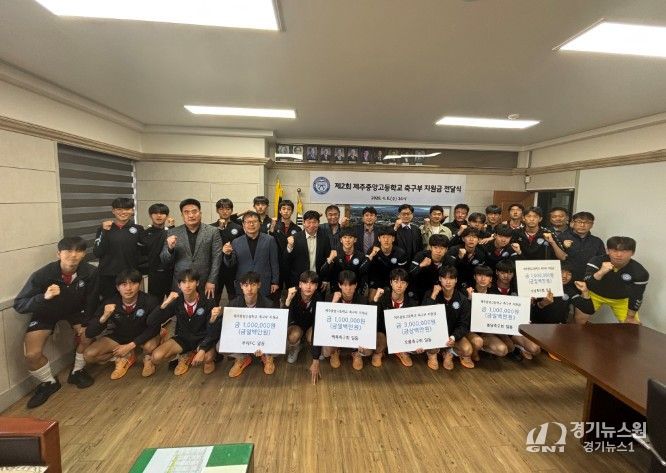 [경기뉴스원/경기뉴스1] | 제주도교육청 제주중앙고등학교는 8일 도내 생활체육 축구 문화를 이끄는 오름축구회, 돌담축구회, 백록축구회, 소낭축구회, 우리축구회(FC) 등 5개 단체로부터 ‘제2회 제주중앙고 축구부 지원금 전달식’을 통해 장학금 700만원을 전달받았다.
