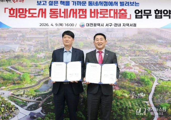 [경기뉴스원/경기뉴스1] | 대전 서구는 9일 구청 갑천누리실에서 지역 서점 2개소와‘희망도서 동네서점 바로대출’ 서비스 업무 협약을 체결했다.
