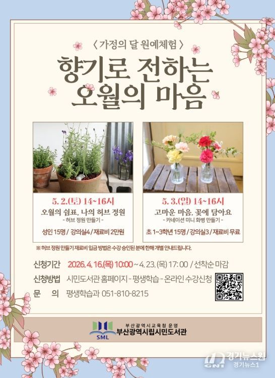 [경기뉴스원/경기뉴스1] | 부산광역시립시민도서관은 오는 5월 2일과 3일 시민도서관 강의실에서 성인과 초등학생 30명을 대상으로 가정의 달 원예체험 ‘향기로 전하는 오월의 마음’을 운영한다.